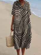Step into sophistication with the Esme Dress, where art meets minimalism. This striking piece features hypnotic curved stripes in black and beige, creating a visually dynamic effect that’s both bold and balanced. With its loose fit and elegant drape, Esme is made for women who embrace clean lines, graphic edge, and effortless style.
