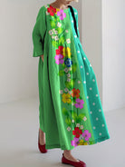 Turn heads with the Anouk Dress – a vibrant green maxi with retro-inspired florals and playful white dots. The soft structure and wide-fit silhouette give it a graceful swing with every step. With ¾ sleeves and vivid colours, it’s the perfect mix of nostalgia and modern flair.